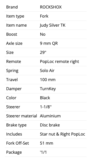 Rockshox Judy Silver TK 29", Solo Air, 9x100mm, straight 1 1/8", 100mm